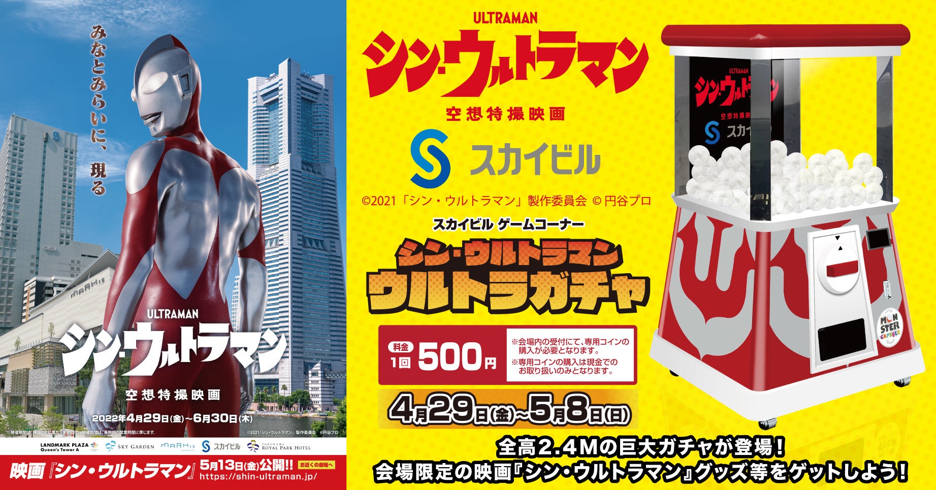 映画 シン ウルトラマン の公開を記念して みなとみらいエリアでコラボレーション企画を開催 その一環として 2 4mの巨大ガチャが登場 スカイビル限定の映画 シン ウルトラマン グッズ等をゲットしよう スマイルタンクのプレスリリース